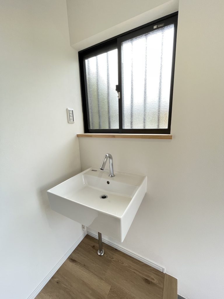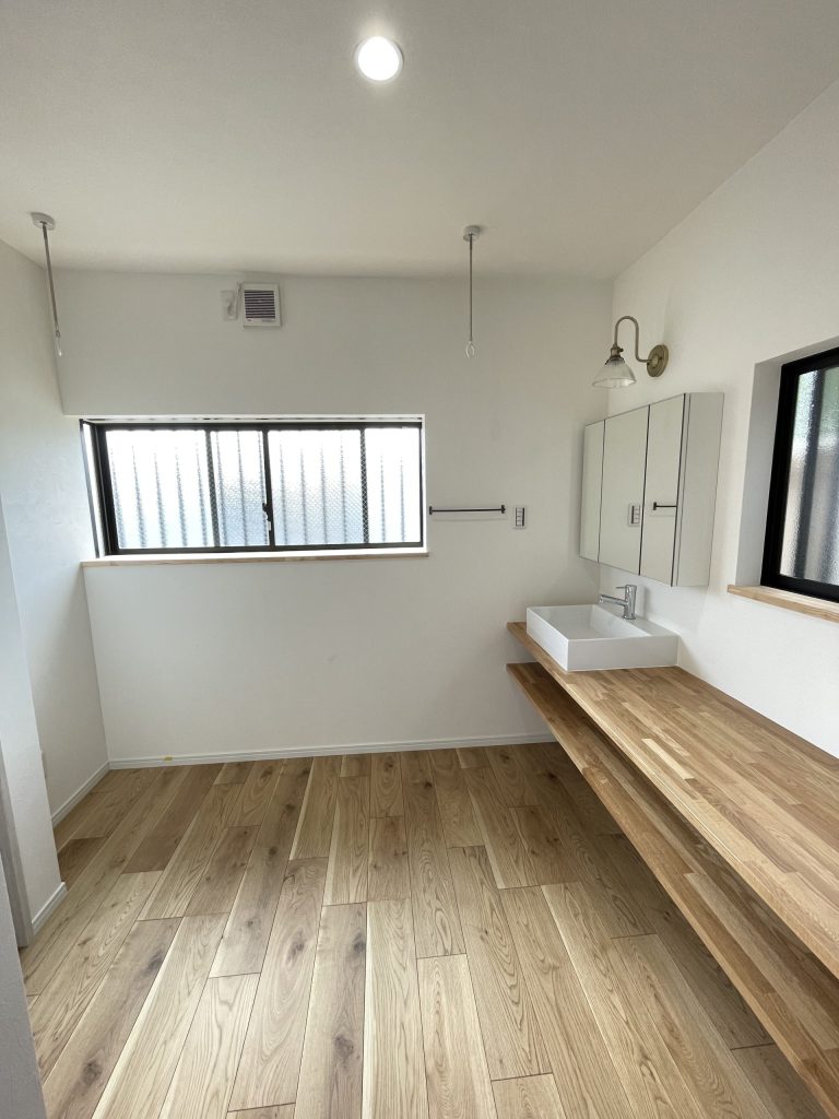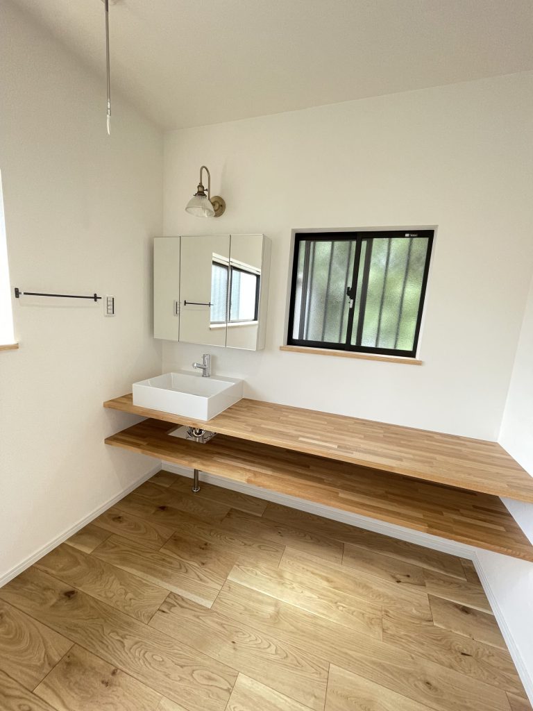 造作洗面台と無垢の床。裸足でも気持ちよさそー
