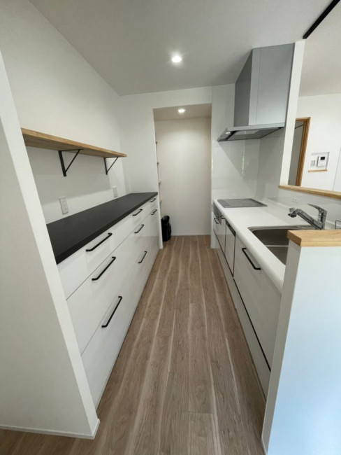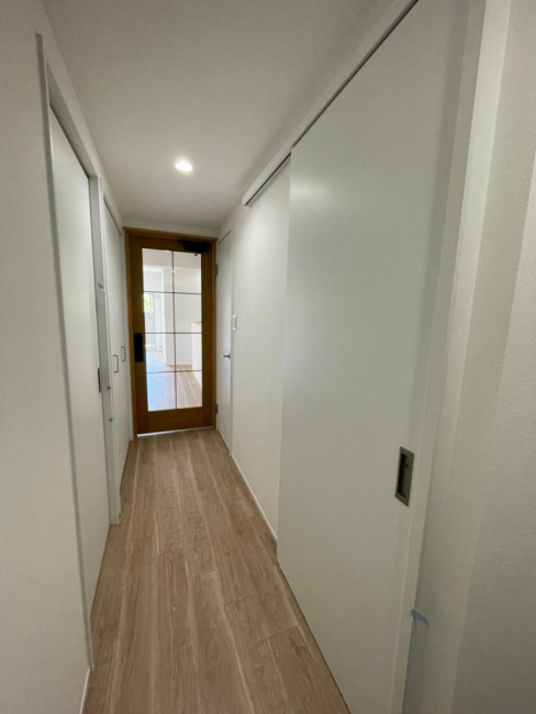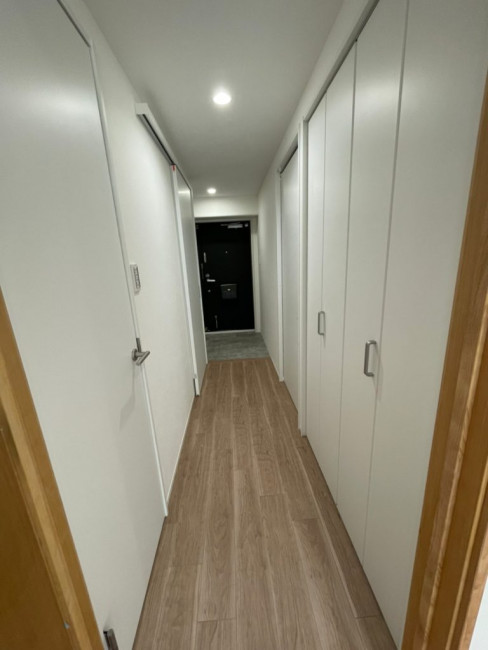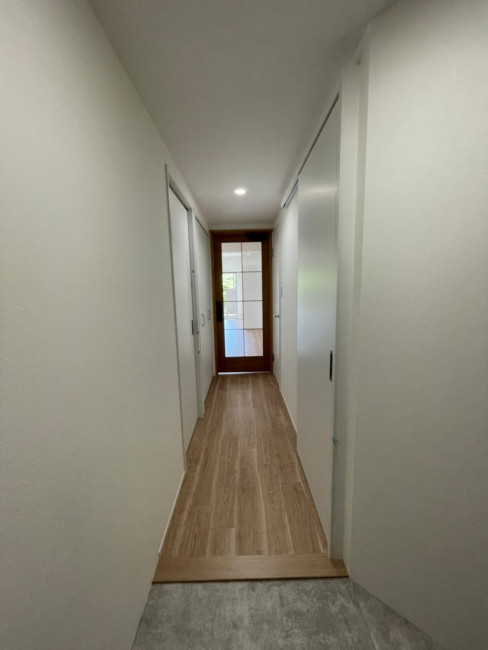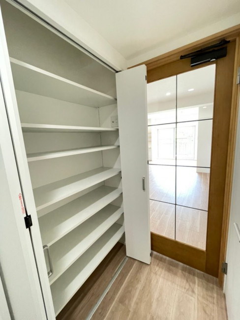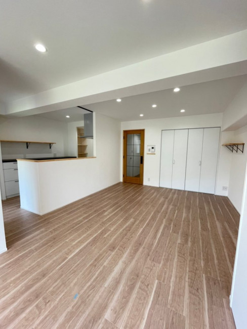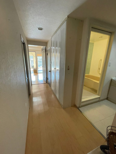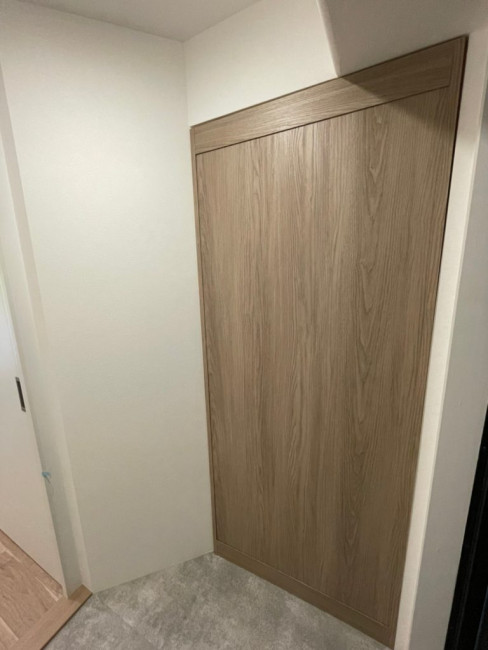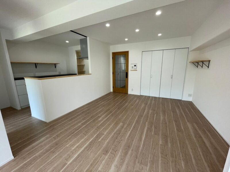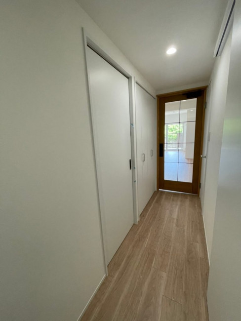 玄関を入って廊下の右手にあった収納スペースを左手側の洋室の方へ移設し、玄関から一直線、同幅でリビングへと続く廊下へとリフォームしました。