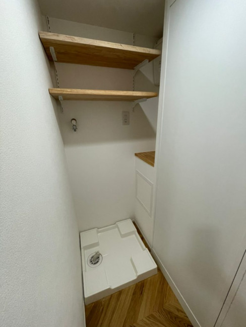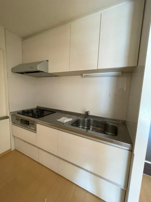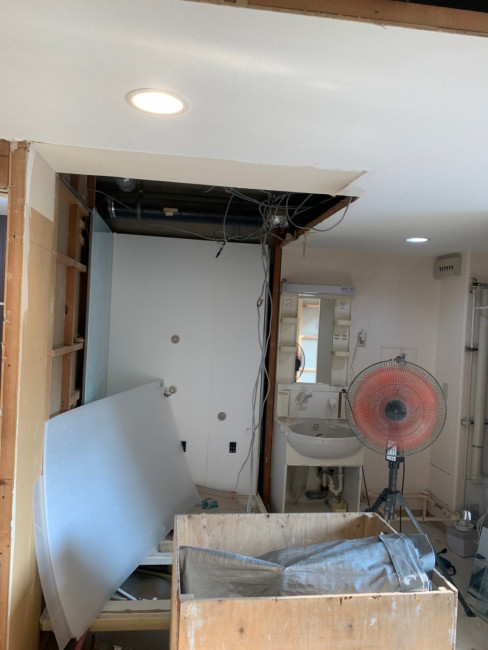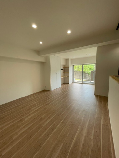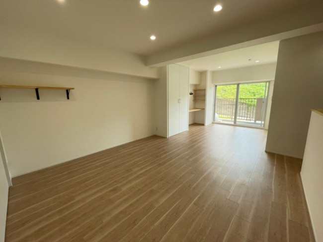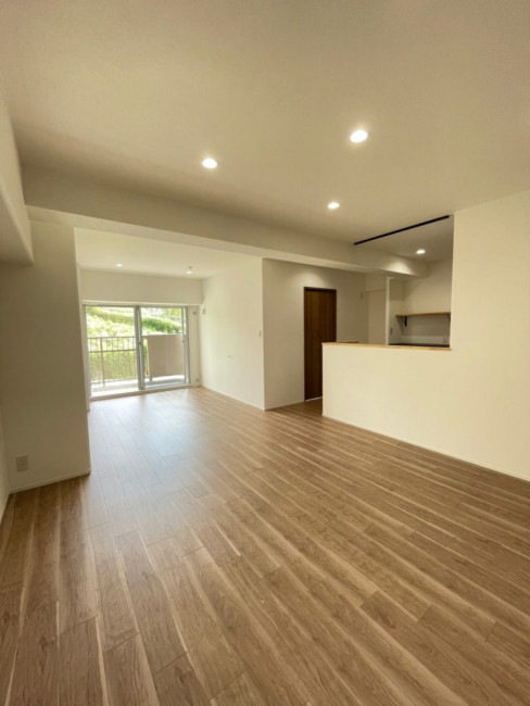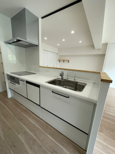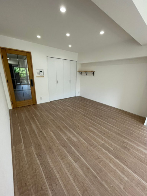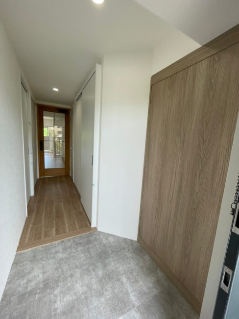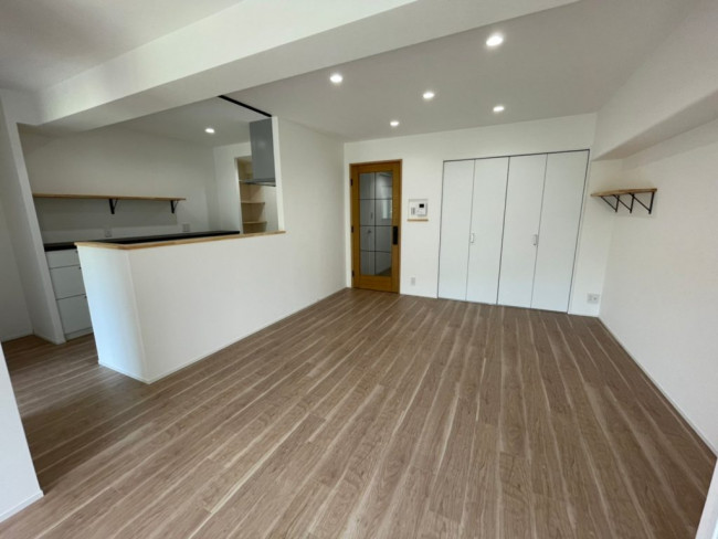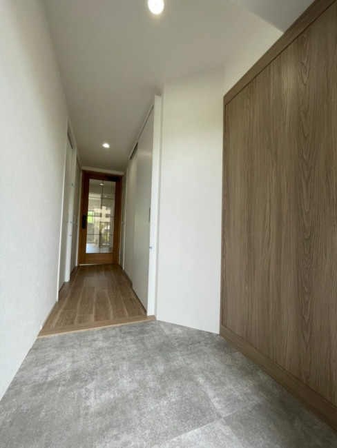 玄関を入って廊下の右手にあった収納スペースを左手側の洋室の方へ移設し、玄関から一直線、同幅でリビングへと続く廊下へとリフォームしました。