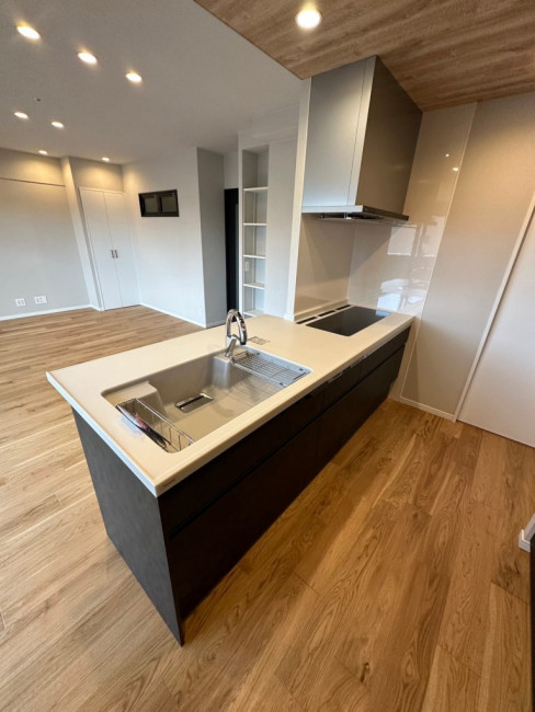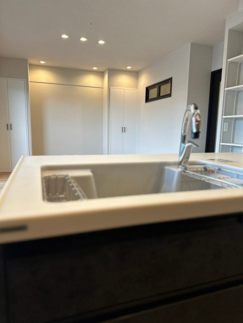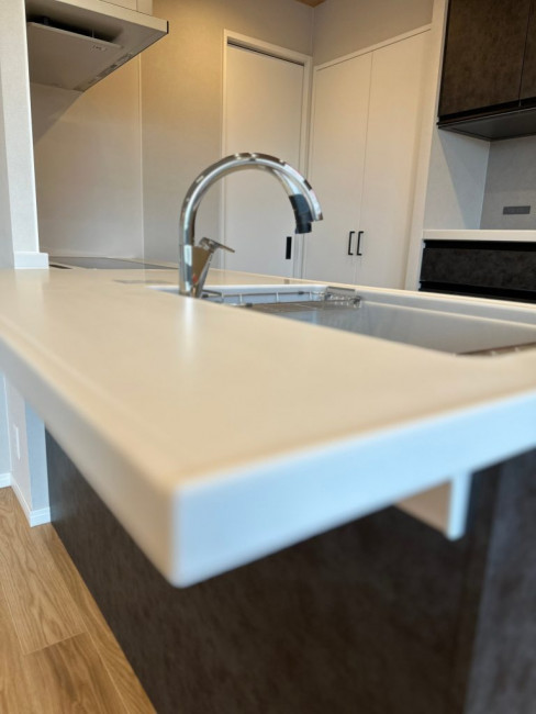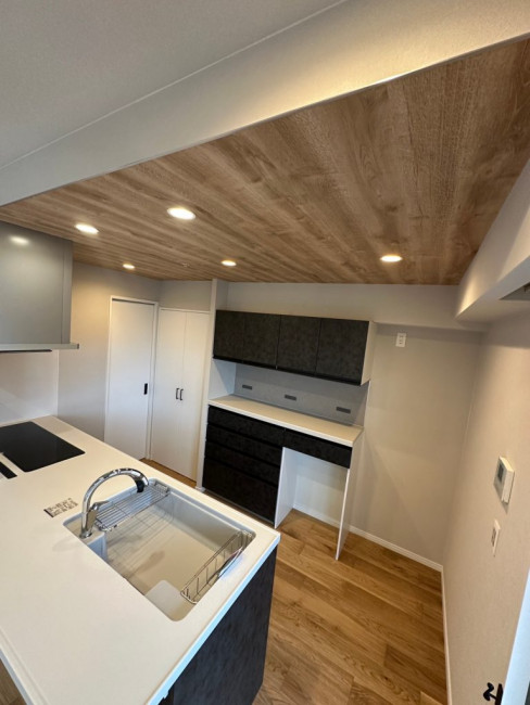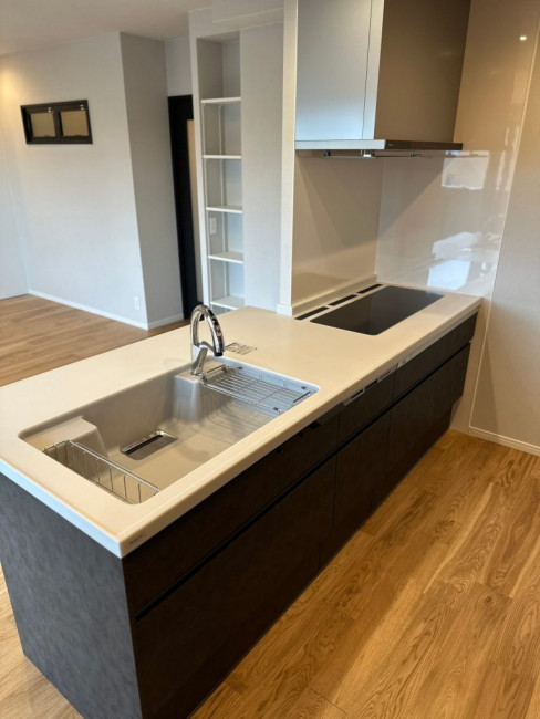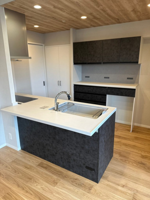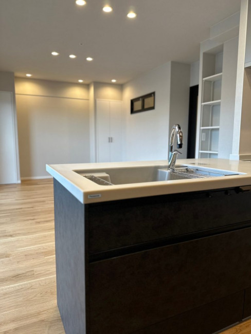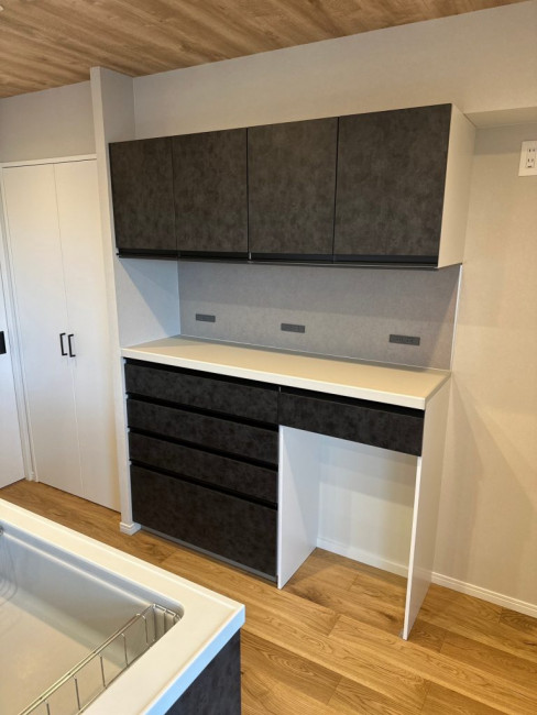 元々は自由にカップボードを置けるようにと空間が広く設けられていましたが、今回はキッチンに合わせて新たなカップボードを設置。収納も増やし全体の雰囲気が変わりました!