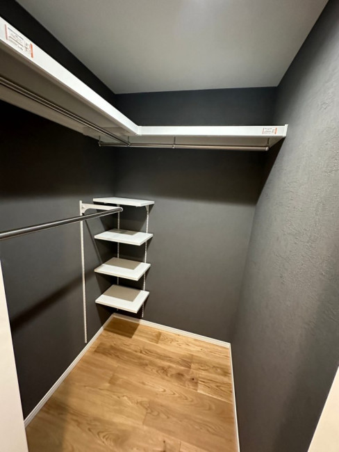 ハンガーパイプと枕棚で上部の空間を最大活用しコーナーには可動棚を設置しました。
