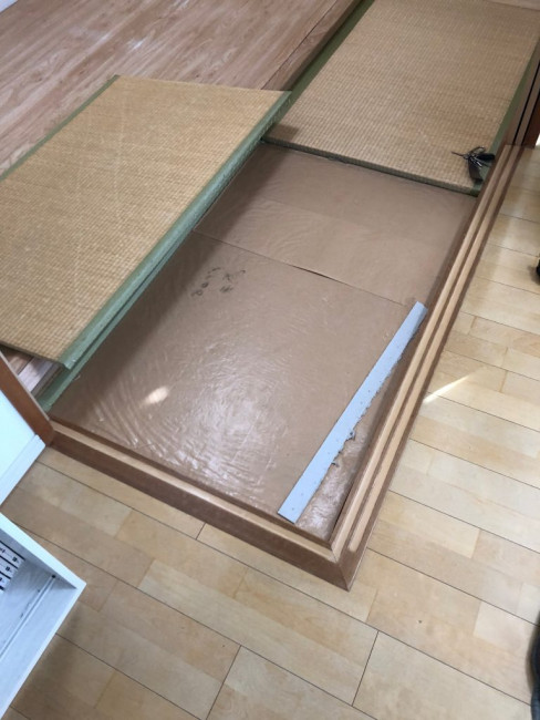このままの状態でフローリングを敷いてしまうと畳の厚さとフローリングでは厚さが異なるため(フローリングの方が薄い)敷居を跨いだ後に床が若干下がってしまいます。