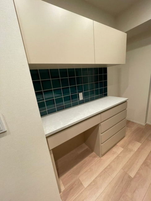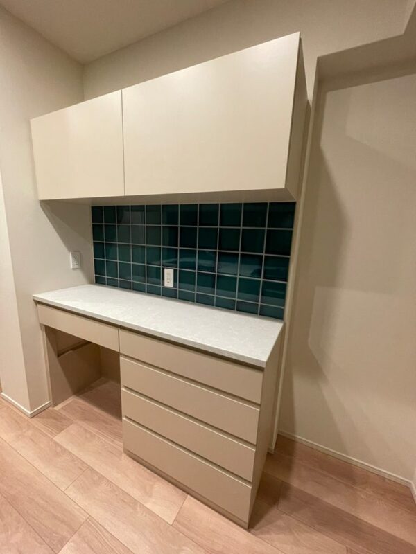 背面にあるグリーンのタイルはもともとのこの作業台のセットにはなく、別で取り寄せて取り付けたものです。