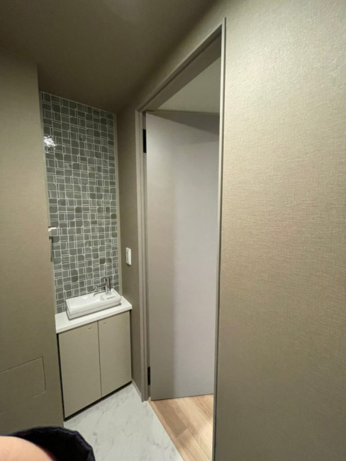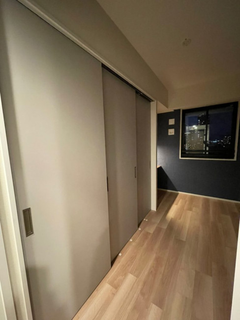 ![]() 左手前が洋室、左手奥がリビングへの扉、右手が洗面室、奥がトイレ。それぞれの建具を変更します。 |