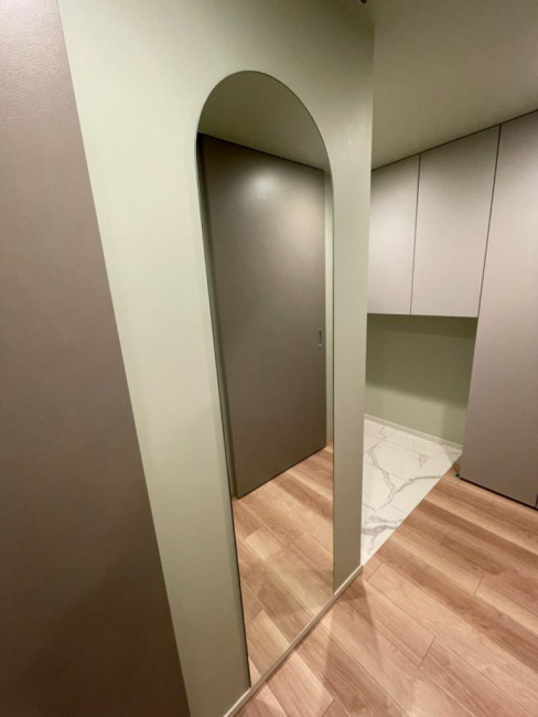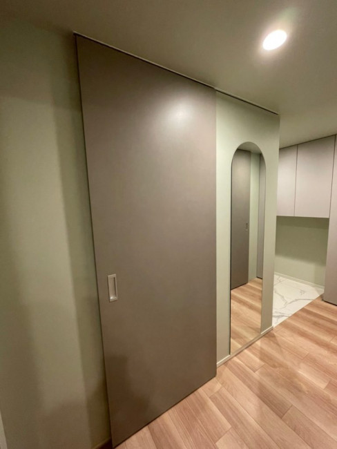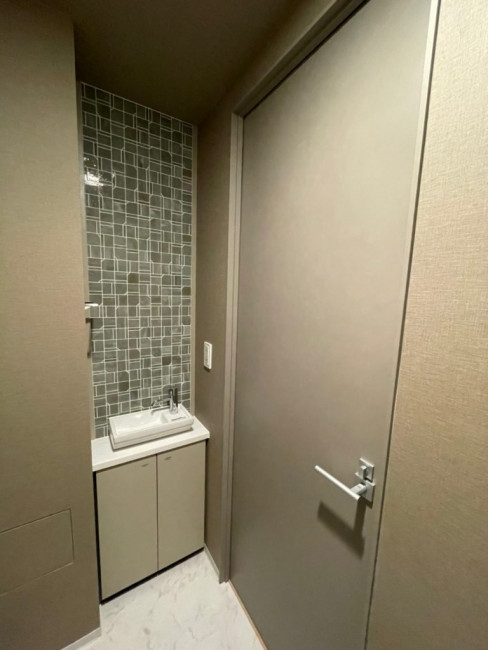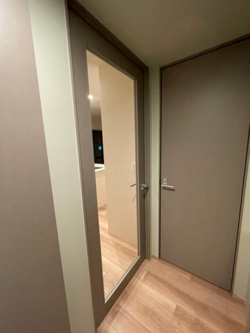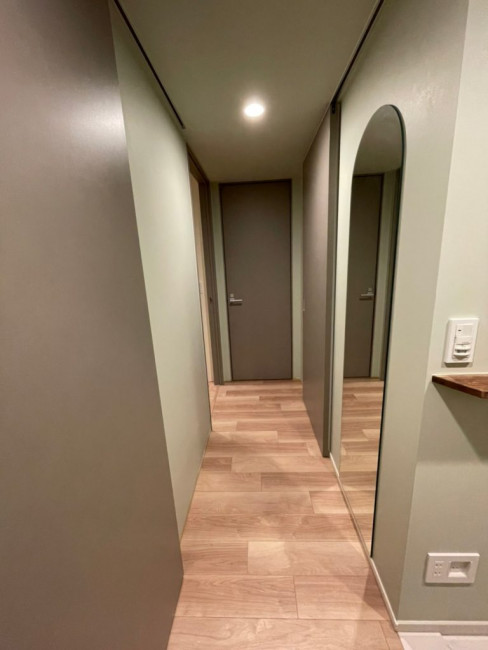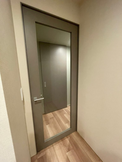 ![]() 洗面室入口の建具の横には姿見も取付 |