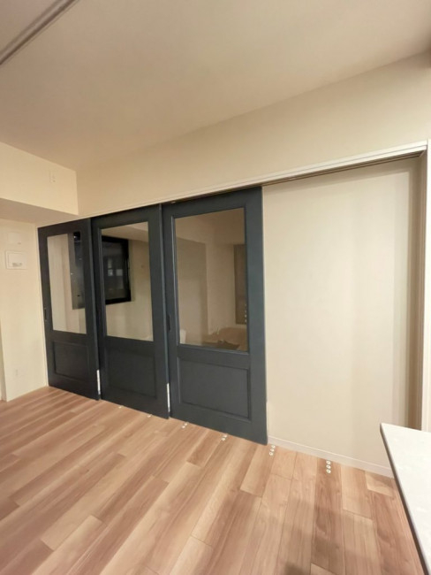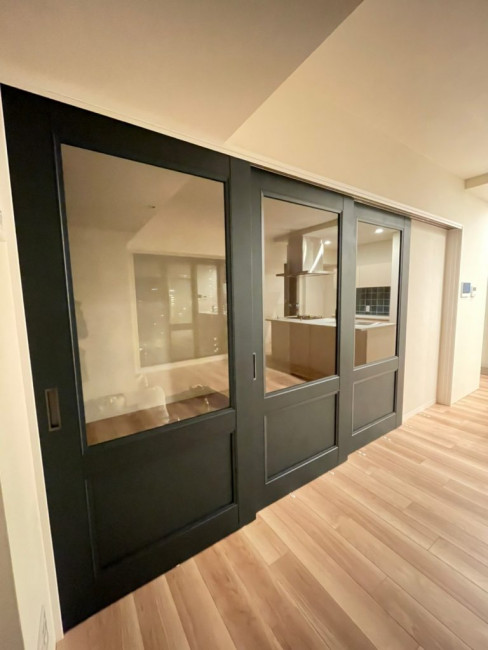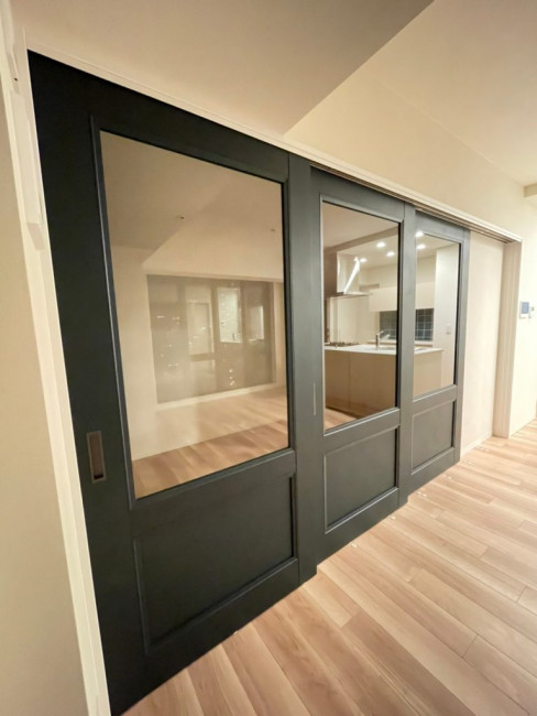 まず三枚引戸はガラスが大きく入ったデザインのものに。ガラスで向こうが透けることでお部屋に奥行きが出て開放感が増しました。