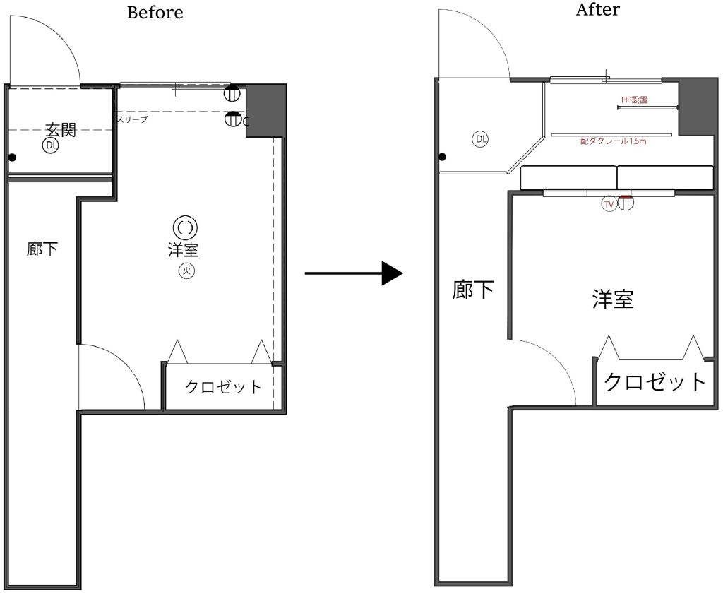 玄関に隣接する洋室ですが、洋室の一部を削り玄関スペースを広くします。