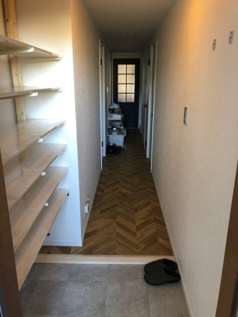 ![]() 写真左、廊下と面する壁が洋室との仕切りとなっている壁。この壁の一部を撤去し玄関スペースを拡大します。 |