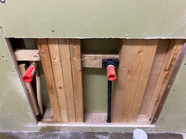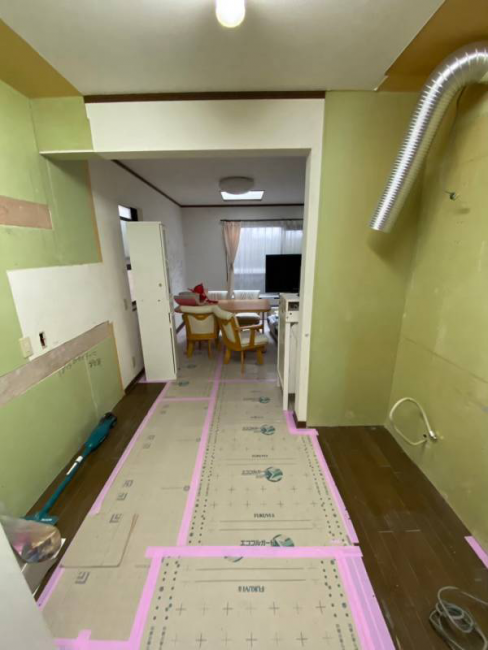 既存のキッチンを外して給水は排水、換気扇や食洗器用の電線配線をします。