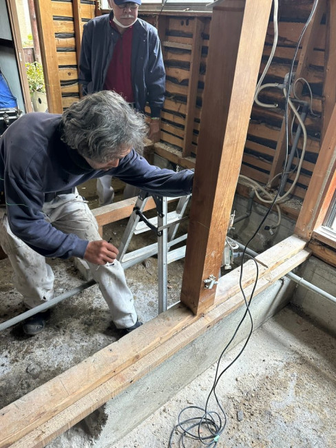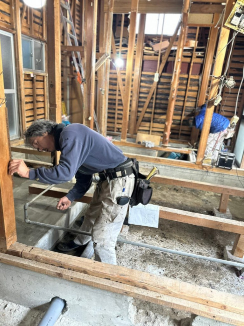 数ミリ単位での調整が求められるため、これだけ真剣な表情で細かくチェックと墨出し(柱などに線を引き基準の線を出していきます)をしています。