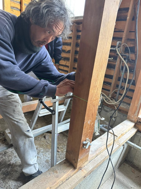 大工さんがかなり真剣な表情で見ているのは家の躯体が傾いていないか?