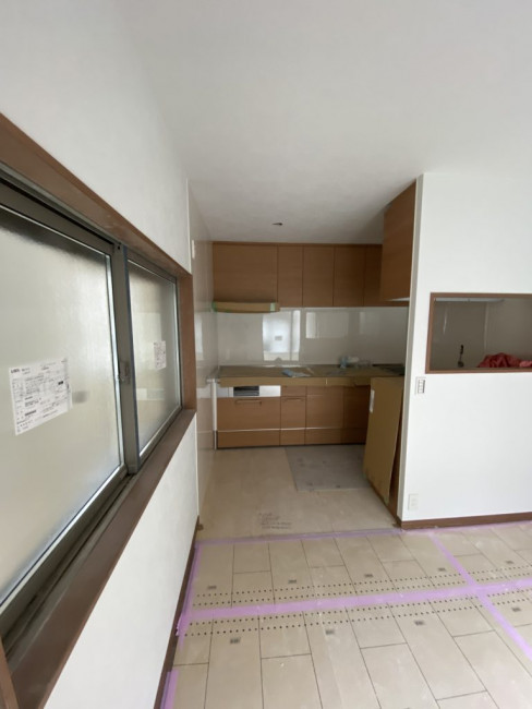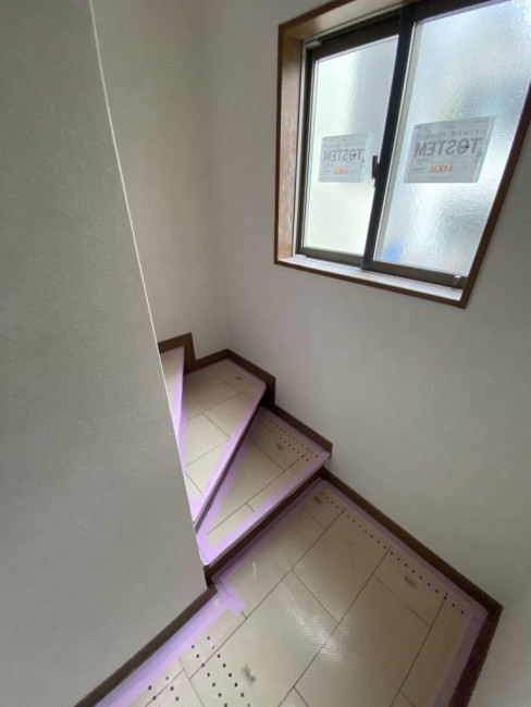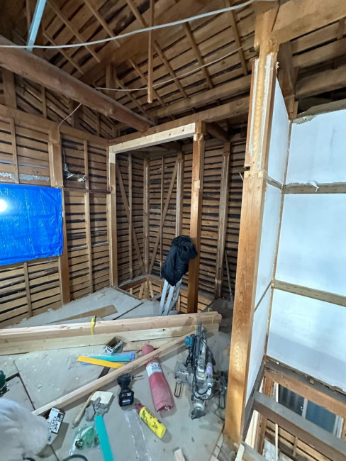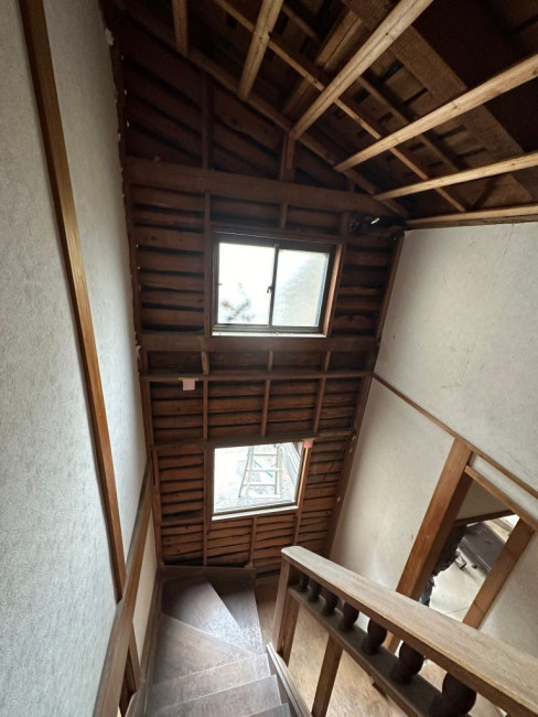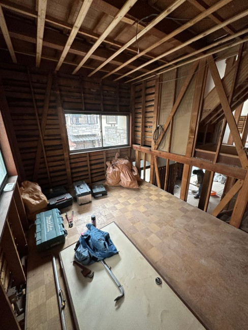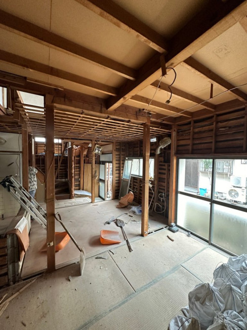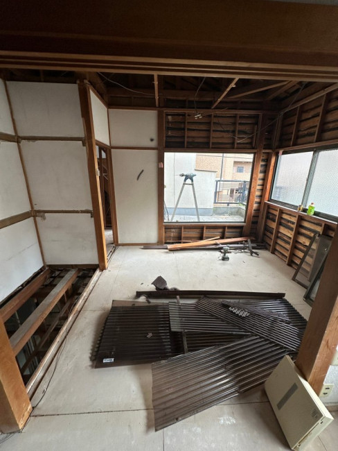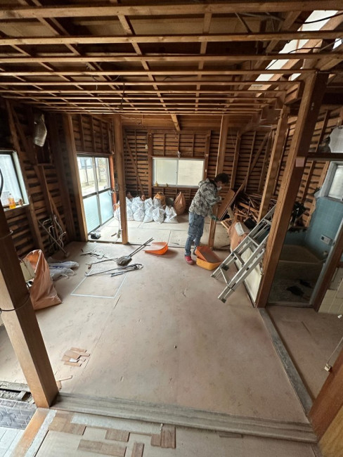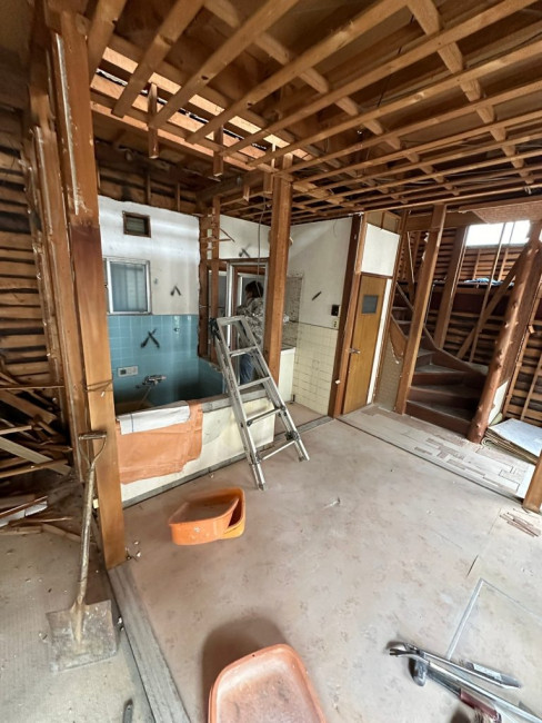 今回のリフォームでは家の外部も塗装などをしていくため、ある程度内装の解体が済んだ段階で足場を立てました。足場が立つとどうしても内部と外部で動線が狭くなり、何かと不便も出てくるためギリギリまで足場を待ってもらいました。