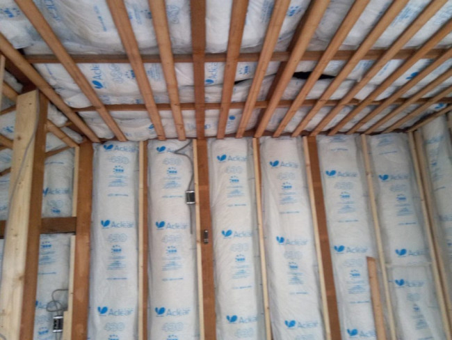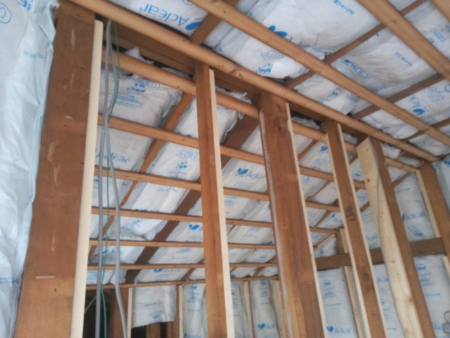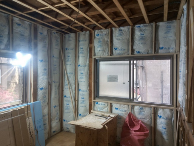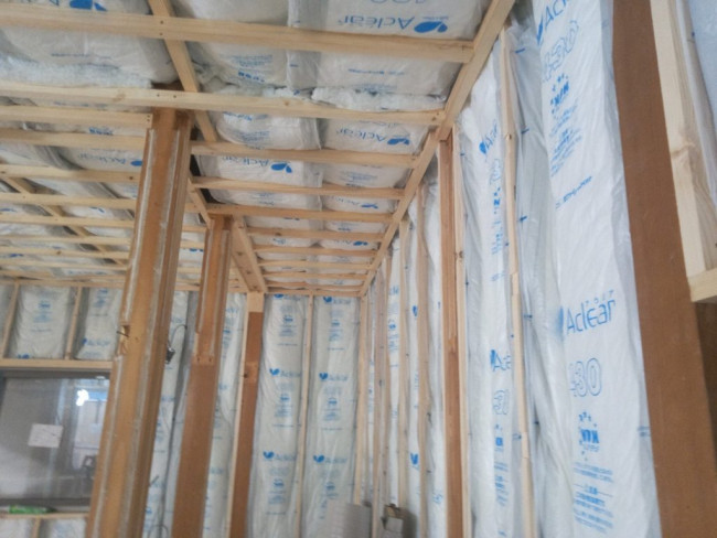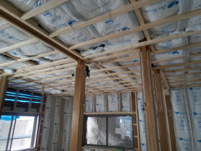 天井と壁の下地が出来上がったので、外部と接する面に断熱材が入れられていきます。