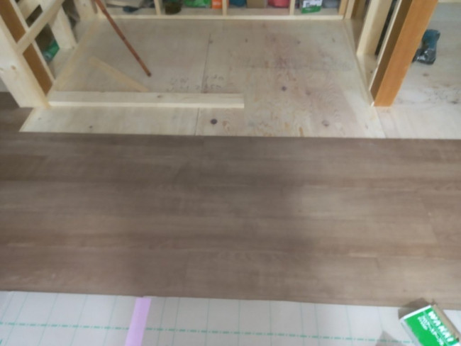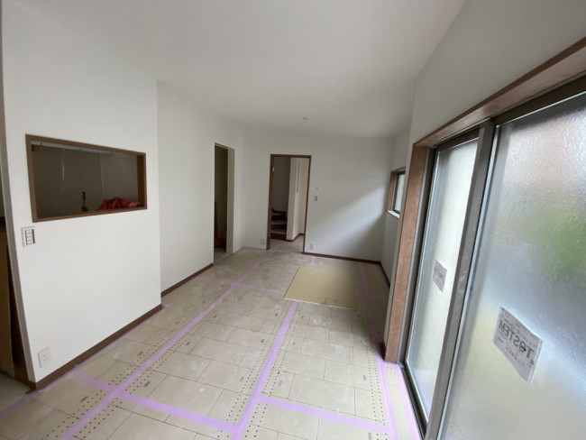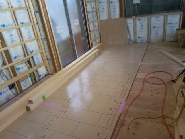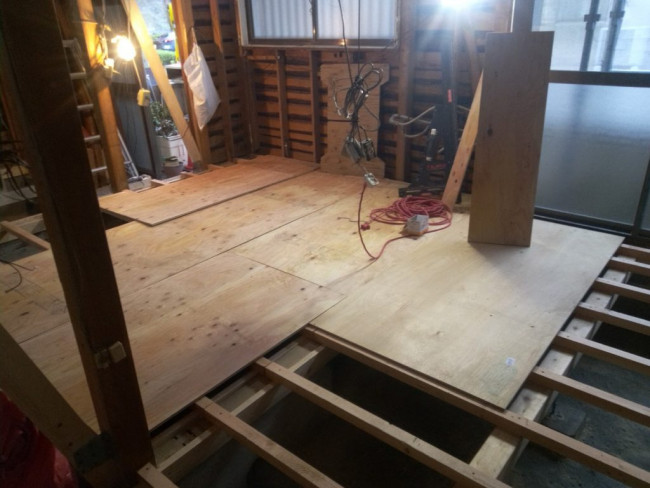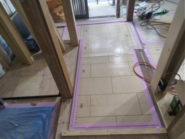 床に見える青い材料は断熱材です。