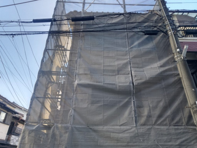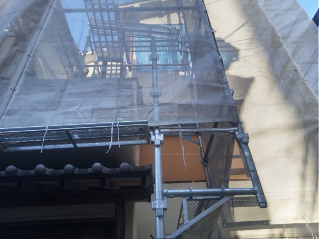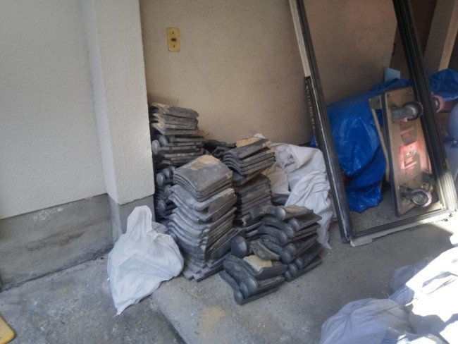 建物の外部には足場が組み上がり、屋根に乗っていた瓦が外されました。
